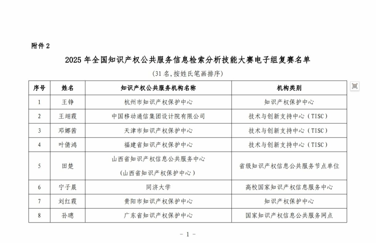 来源:《关于发布2025年全国知识产权公共服务信息检索分析技能大赛复赛名单的通知》https://ggfw.cnipa.gov.cn/public-info-mgt/detail/82?t=1758615501831