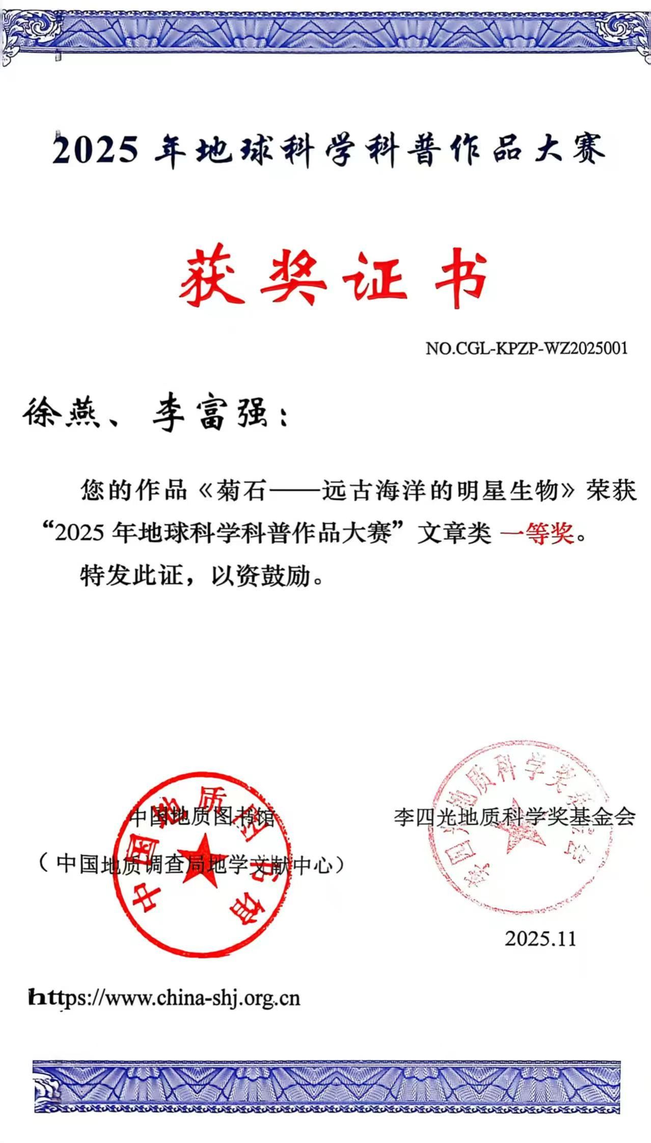 近日,2025年地球科学科普作品大赛评选工作圆满结束,我部逸夫博物馆徐燕、李富强老师创作的《菊石——远古海洋的明星生物》获得文章类一等奖。