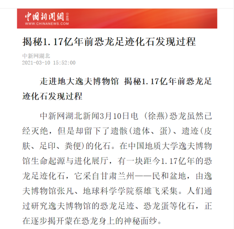 中新网湖北新闻3月10日电 恐龙虽然已经灭绝,但是却留下了遗骸(遗体、蛋)、遗迹(皮肤、足印、粪便)的化石。在中国地质大学逸夫博物馆生命起源与进化展厅,有一块距今1.17亿年的恐龙足迹化石,它采自甘肃兰州——民和盆地,由逸夫博物馆张凡、地球科学学院蔡雄飞采集。人们通过研究逸夫博物馆的恐龙足迹、恐龙蛋等化石,正在逐步揭开蒙在恐龙身上的神秘面纱。