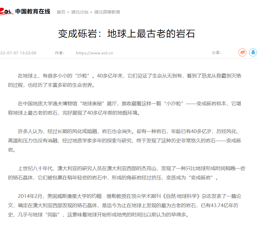在中国地质大学逸夫博物馆“地球奥秘”展厅,就收藏着这样一颗“小沙粒”——变成砾岩标本,它堪称地球上最古老的岩石,完好展现了40多亿年前的地貌环境。