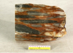 通过观察中国地质大学逸夫博物馆收藏的这块变成砾岩标本,可以发现,这种变成砾岩颜色呈灰褐色相间,其中角砾呈灰色、基质呈褐红色。为角砾状结构,块状构造,角砾和基质的主要成分都是石英质的。