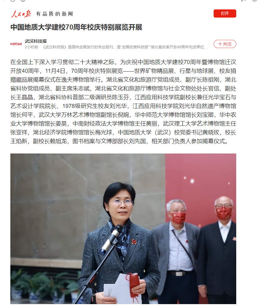 相关负责人介绍,70年来,伴随着学校事业的蓬勃发展,中国地质大学(武汉)逸夫博物馆不断强特色、入主流、争主导,坚持面向社会广泛开展地学科普教育,充分发挥育人功能,精心打造科普教育品牌,不断根据社会需求推出特色展览,发展成为集国家二级博物馆、全国科普教育基地、全国首批“大思政课”实践教学基地、全国中小学生研学实践教育基地等数十项荣誉称号为一身的国家AAAA级旅游景区,积极为“美丽中国、宜居地球”建设贡献力量,用科普梦汇聚起实现中国梦的磅礴力量。