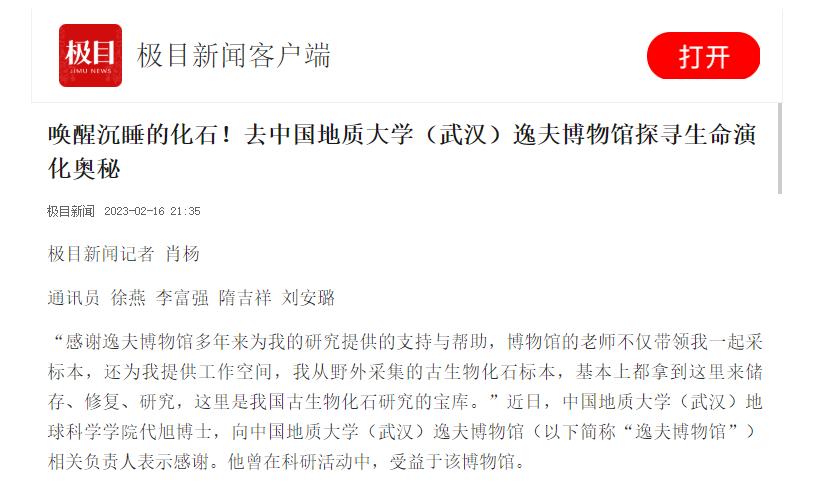“感谢逸夫博物馆多年来为我的研究提供的支持与帮助,博物馆的老师不仅带领我一起采标本,还为我提供工作空间,我从野外采集的古生物化石标本,基本上都拿到这里来储存、修复、研究,这里是我国古生物化石研究的宝库。”近日,中国地质大学(武汉)地球科学学院代旭博士,向中国地质大学(武汉)逸夫博物馆(以下简称“逸夫博物馆”)相关负责人表示感谢。他曾在科研活动中,受益于该博物馆。