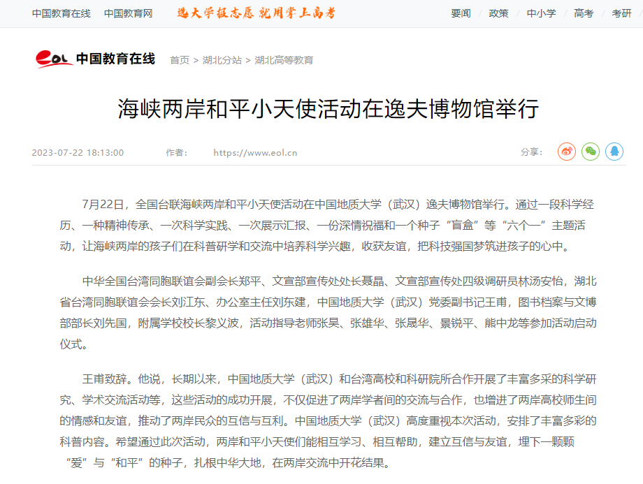 7月22日,全国台联海峡两岸和平小天使活动在中国地质大学(武汉)逸夫博物馆举行。通过一段科学经历、一种精神传承、一次科学实践、一次展示汇报、一份深情祝福和一个种子“盲盒”等“六个一”主题活动,让海峡两岸的孩子们在科普研学和交流中培养科学兴趣,收获友谊,把科技强国梦筑进孩子的心中。