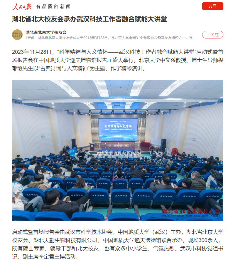 2023年11月28日,“科学精神与人文情怀——武汉科技工作者融合赋能大讲堂”启动式暨首场报告会在中国地质大学逸夫博物馆报告厅盛大举行,北京大学中文系教授、博士生导师程郁缀先生以“古典诗词与人文精神”为主题,作了精彩演讲。