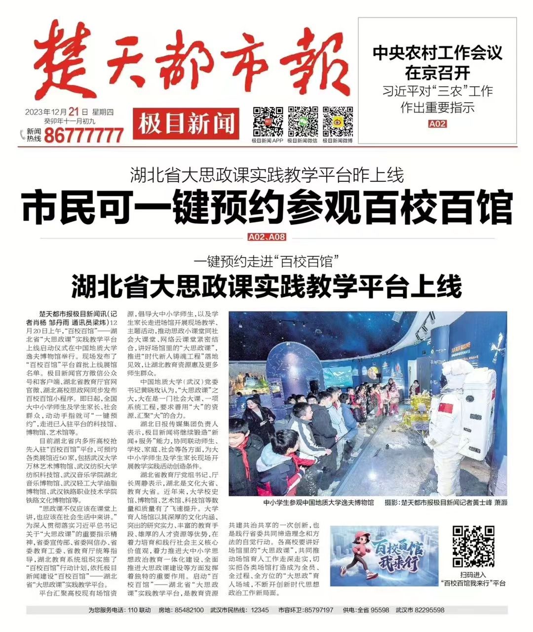 “这里有珍贵的恐龙化石!”12月20日,“百校百馆”——湖北省“大思政课”实践教学平台上线启动仪式在中国地质大学逸夫博物馆举行,湖北省委宣传部、湖北省教育厅、湖北日报传媒集团相关负责人,武汉大学、华中科技大学等23所高校负责同志出席,大中小学生及家长代表两百余人参加。