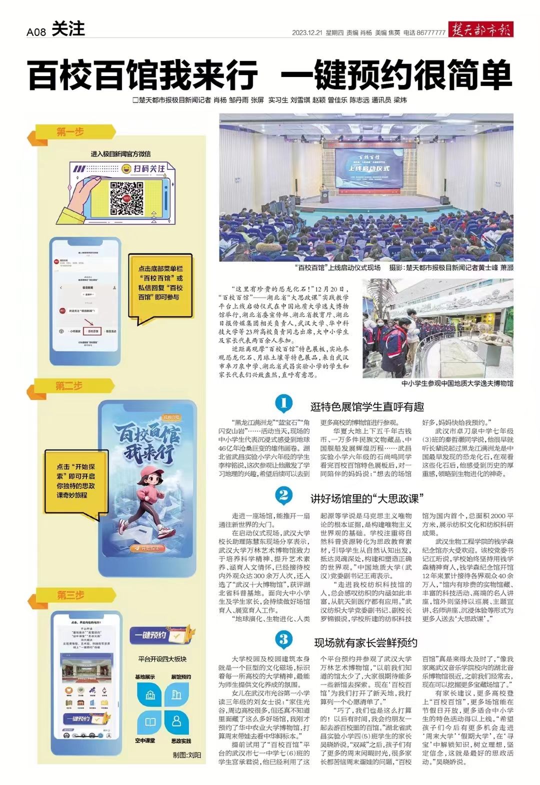 提前试用了“百校百馆”平台的武汉市七一中学七(6)班的学生宫承君说,他已经利用了这个平台预约并参观了武汉大学万林艺术博物馆,“以前我们知道的馆太少了,大家很期待能多一些新馆去探索。现在‘百校百馆’为我们打开了新天地,我打算列一个心愿清单了。”