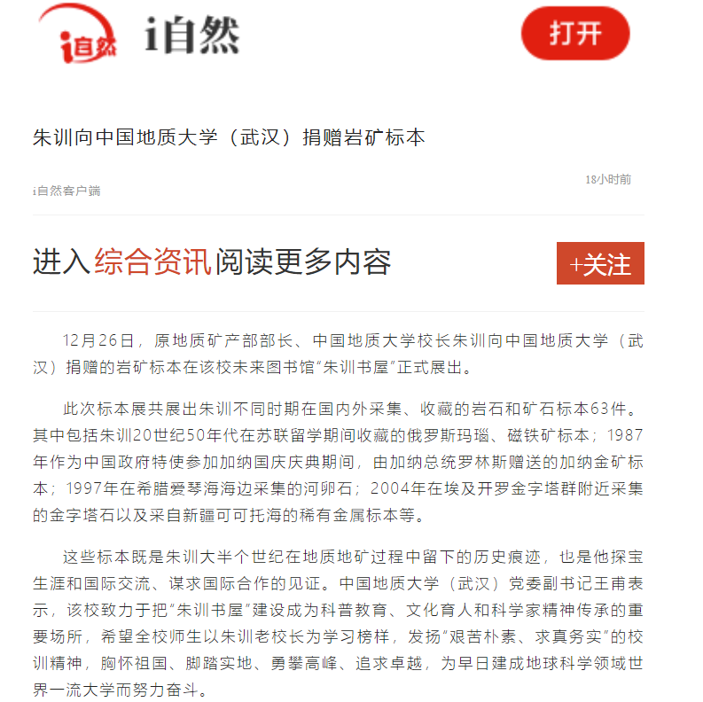 12月26日,原地质矿产部部长、中国地质大学校长朱训向中国地质大学(武汉)捐赠的岩矿标本在该校未来图书馆“朱训书屋”正式展出。
