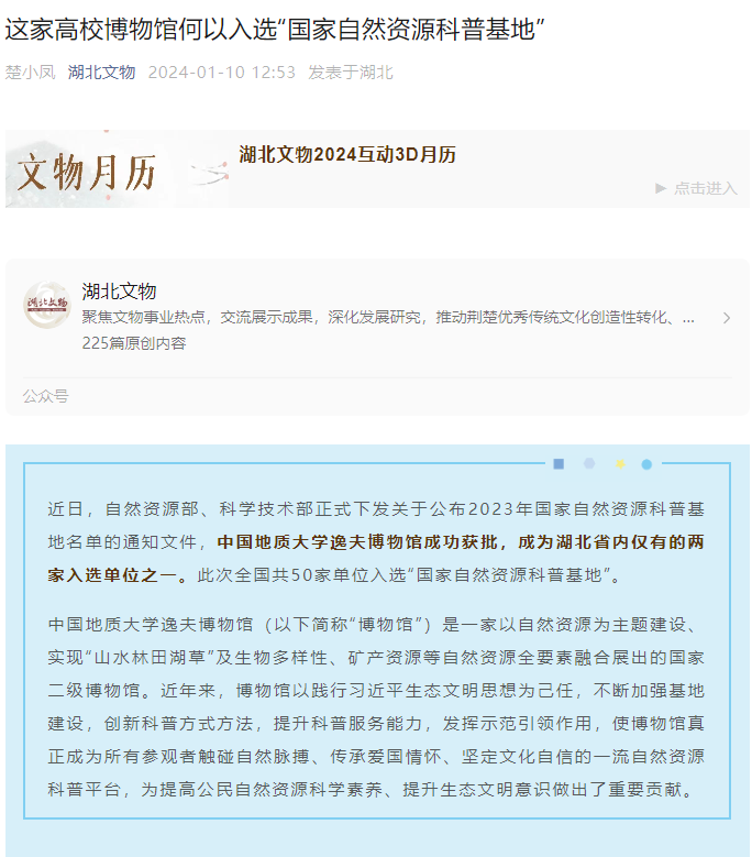 近日,自然资源部、科学技术部正式下发关于公布2023年国家自然资源科普基地名单的通知文件,中国地质大学逸夫博物馆成功获批,成为湖北省内仅有的两家入选单位之一。此次全国共50家单位入选“国家自然资源科普基地”。