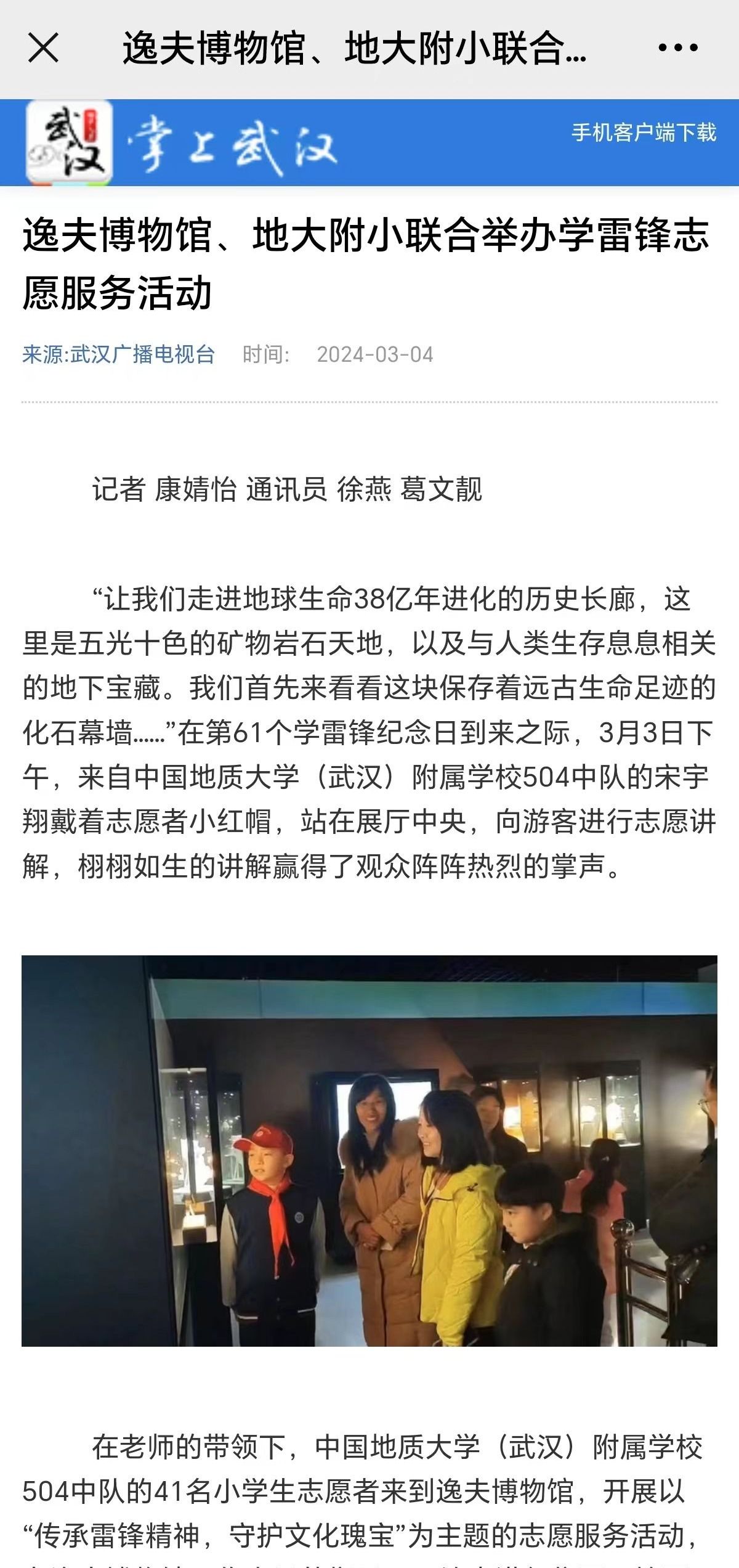 在老师的带领下,中国地质大学(武汉)附属学校504中队的41名小学生志愿者来到逸夫博物馆,开展以“传承雷锋精神,守护文化瑰宝”为主题的志愿服务活动,在逸夫博物馆工作人员的指导下,认真进行售票、检票、游客咨询、讲解、打扫卫生、整理宣传资料等志愿服务,用实际行动践行雷锋精神。虽然年纪小,但他们的热情和认真态度感染了每一位参观者。