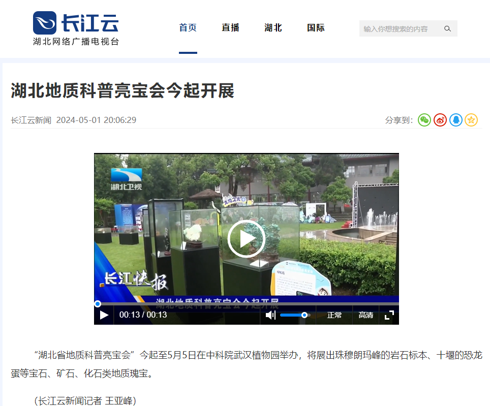 “湖北省地质科普亮宝会”今起至5月5日在中科院武汉植物园举办,将展出珠穆朗玛峰的岩石标本、十堰的恐龙蛋等宝石、矿石、化石类地质瑰宝。