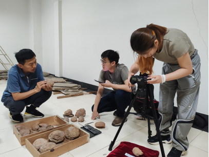 5月21日,逸夫博物馆地下室库房。在该校地球科学学院副教授韩凤禄的指导下,2021级博士生武瑞手拿刻刀和游标卡尺,正在对数颗恐龙蛋化石标本进行采样,一旁的研二学生许佳煜则对这些标本一一进行拍照保存。