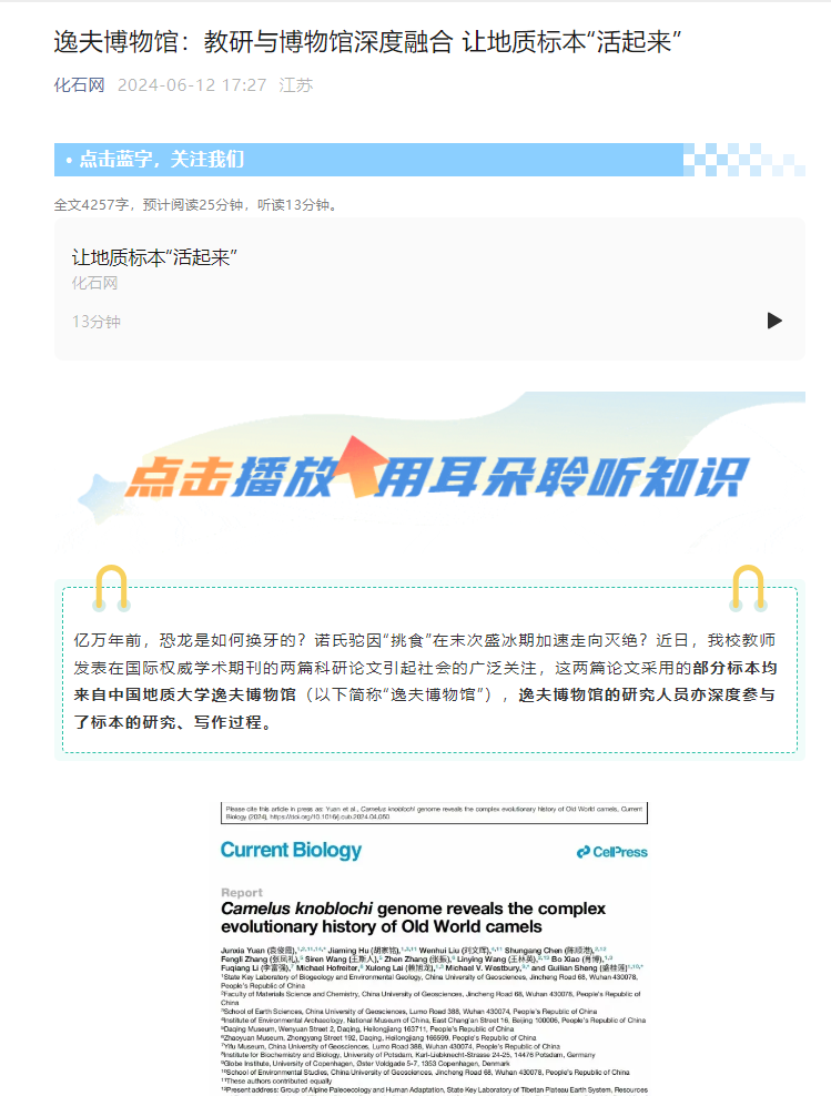 亿万年前,恐龙是如何换牙的?诺氏驼因“挑食”在末次盛冰期加速走向灭绝?近日,我校教师发表在国际权威学术期刊的两篇科研论文引起社会的广泛关注,这两篇论文采用的部分标本均来自中国地质大学逸夫博物馆(以下简称“逸夫博物馆”),逸夫博物馆的研究人员亦深度参与了标本的研究、写作过程。