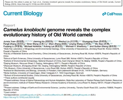 经过对这根诺氏驼跖骨标本以及大庆博物馆、肇源博物馆化石样品长达四年半的研究,中国地质大学(武汉)生物地质与环境地质国家重点实验室赖旭龙教授、盛桂莲教授领导的古DNA团队联合中国国家博物馆、丹麦哥本哈根大学、中国地质大学逸夫博物馆等研究机构的科研人员,在国际学术出版社Cell Pres旗下期刊《当代生物学》上发表了研究成果《诺氏驼古基因组研究揭示旧大陆骆驼复杂的演化历史》。