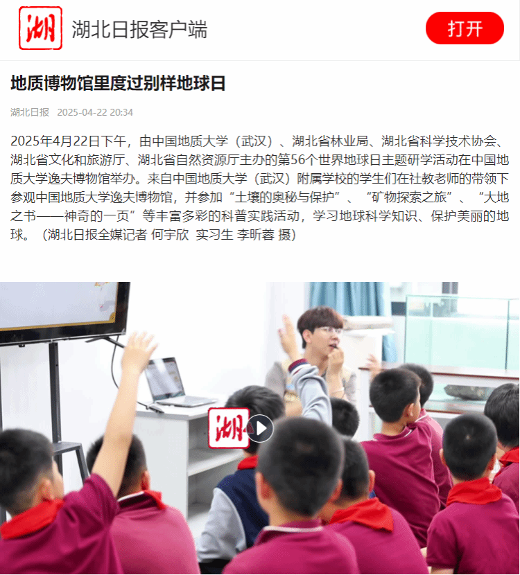2025年4月22日下午,由中国地质大学(武汉)、湖北省林业局、湖北省科学技术协会、湖北省文化和旅游厅、湖北省自然资源厅主办的第56个世界地球日主题研学活动在中国地质大学逸夫博物馆举办。来自中国地质大学(武汉)附属学校的学生们在社教老师的带领下参观中国地质大学逸夫博物馆,并参加“土壤的奥秘与保护”、“矿物探索之旅”、“大地之书——神奇的一页”等丰富多彩的科普实践活动,学习地球科学知识、保护美丽的地球。