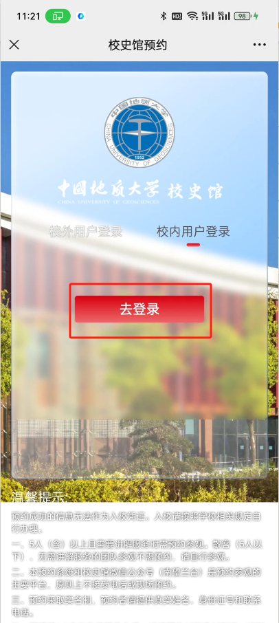二、本预约系统和校史馆微信公众号(南望兰台)是预约参观的主要平台,原则上不接受电话或现场预约;